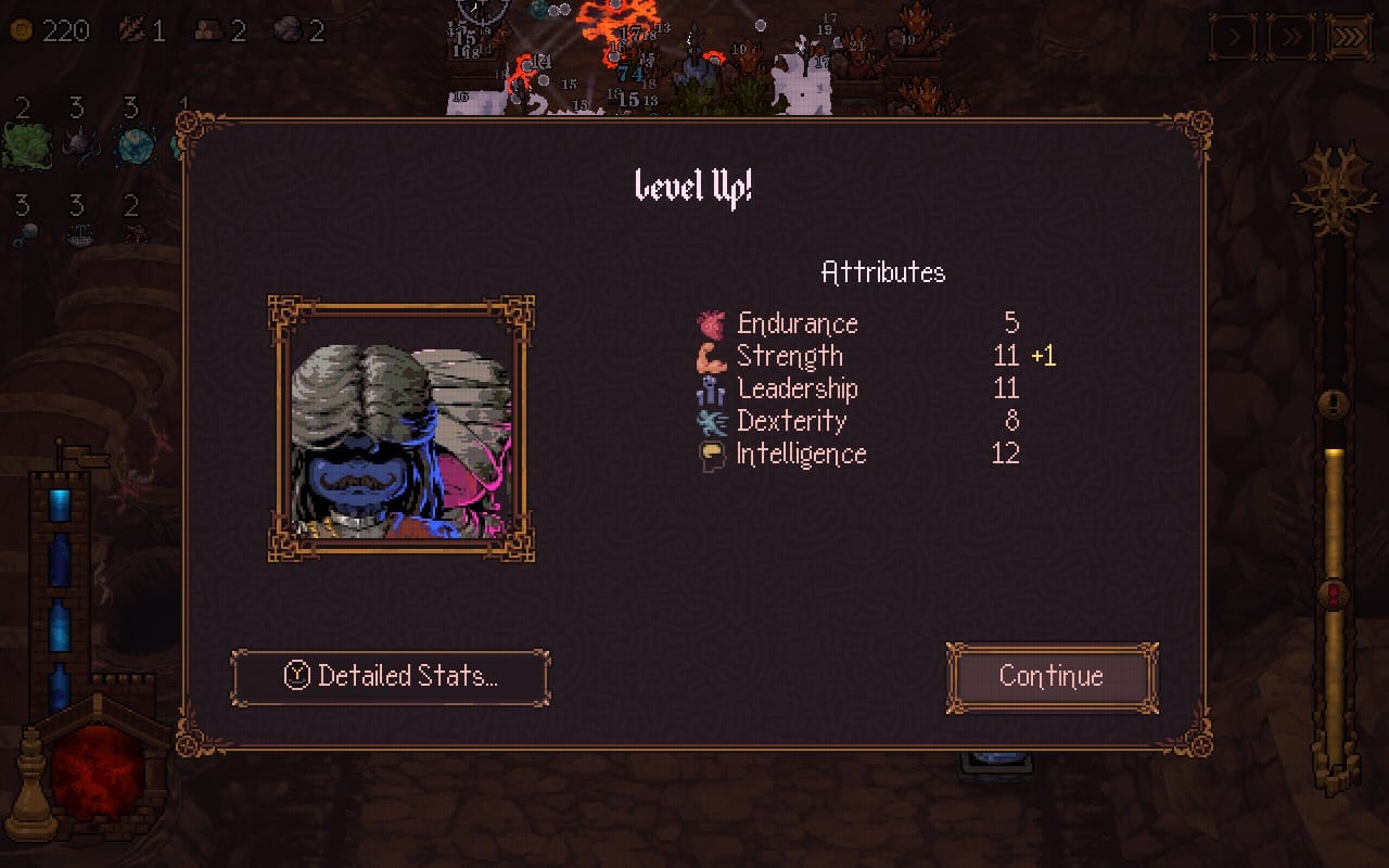 Characters themselves level up as you use them, increasing their stats and unlocking some side effects for the 'town' that you manage in between levels. The town lets you place buildings that collect resources and provide some general meta progression across characters. I didn't really like this part of the game. I can see what they were going for with it but I found the placement of buildings and the interaction with them more frustrating than interesting.